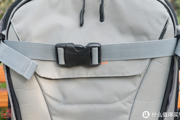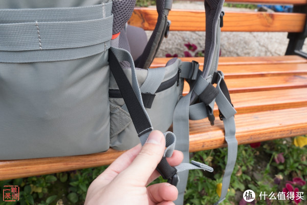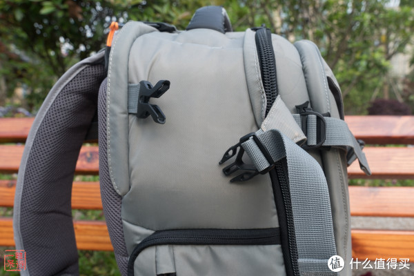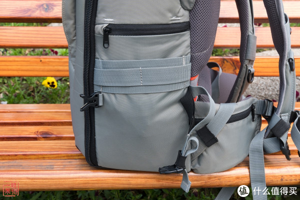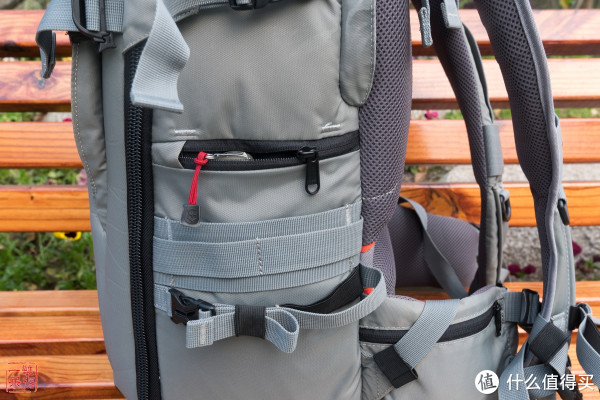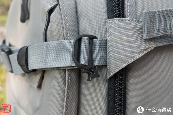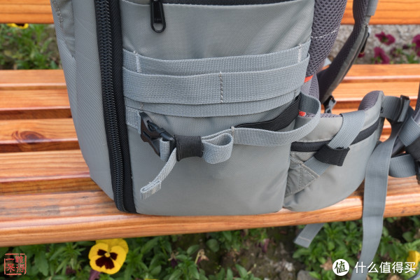 ▼ ▽摄影背包侧面上部有条带有插扣的织带。这条织带的目的是保护主仓拉链意外打开,造成器材的破损或者丢失。