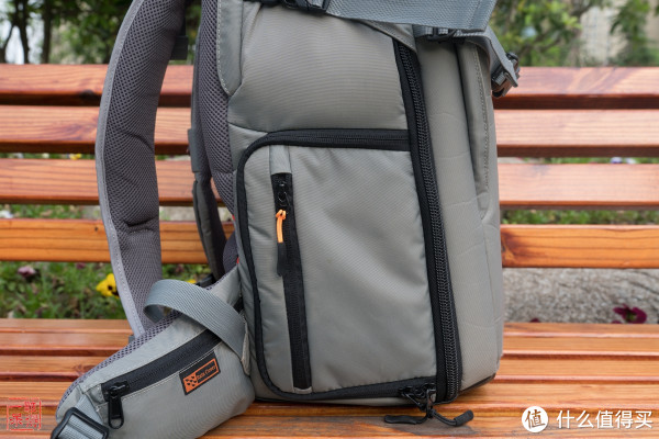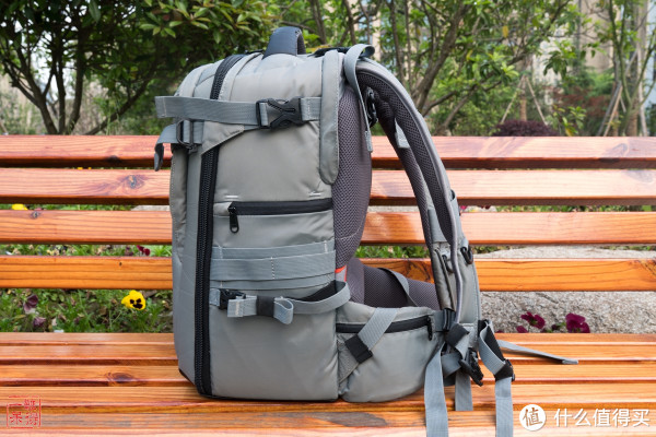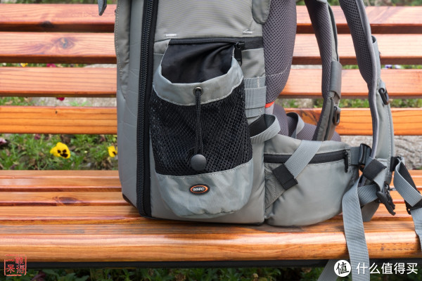 ▼ ▽介绍完摄影背包正面后,再介绍摄影背包侧面。从侧面看,摄影背包还是挺厚的。