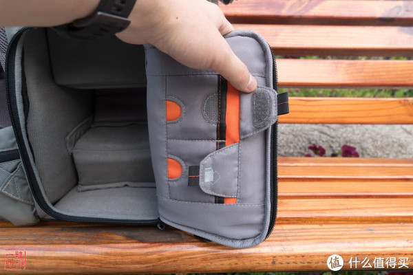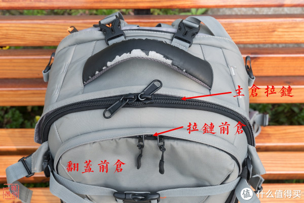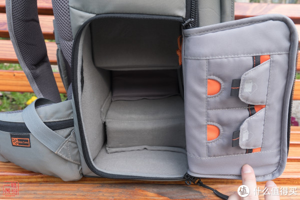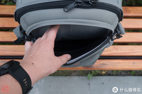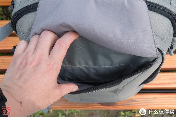 ▼ ▽而背包里侧的拉链前仓防护更好些,这里应该是独立的笔记本电脑仓。翻盖前仓与拉链前仓之间的隔板挺厚实的,触摸后感觉有凹槽设计,这个没法拍出来,据说是“热压成型工艺,携带三脚架、笔记本电脑时防碰撞抗震动,能有效隔绝寒冷、高热和湿气”……