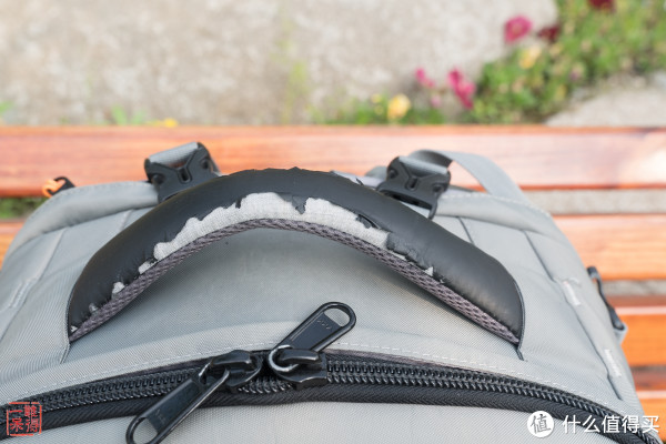 ▼ ▽从摄影背包顶部开始介绍。摄影背包顶部有条大拉链和磨损的拎手。大拉链是主仓的开口。而拎手是这个摄影背包使用痕迹最明显的地方。拎手设计挺厚实的,很有安全感。拎手正面用了人造革,背面用了三明治透气网布,中间辅以较厚的填充料。比较遗憾的是,人造革用久了必定磨损,所以是一呆君最不喜欢的材质。