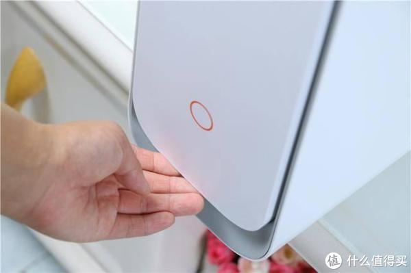 净水器的前面板是可以拆卸的,采用磁吸式设计,开合非常简单。前面板下方的红色圆圈使用来装饰的,不过看上去倒像是电脑主机的开关。
