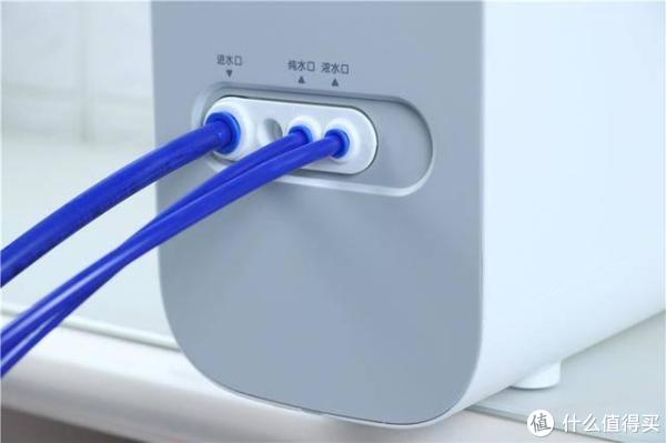 机身背面标注了这款净水器的详细参数,除此之外,位于上方的则是电源插口,下方则是水管接口。水管接口主要包括了:进水孔,纯水孔以及浓水孔。进水孔是用来连接自来水的,纯水孔是用来输出净化后的水,浓水孔则是用来排废水的。