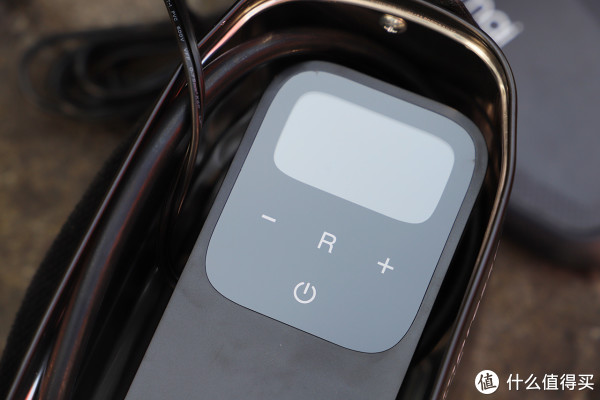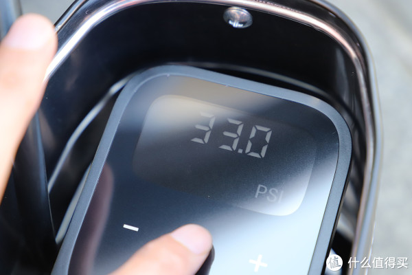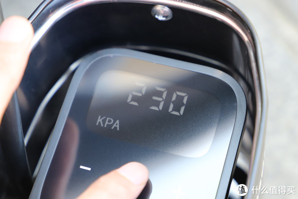 铁盒内可以看到充气泵的触控面板,上面配备了一块LED数位管屏用来显示压力表设定值和实时胎压等信息,相比传统充气泵的指针式显示表更为精准易读。