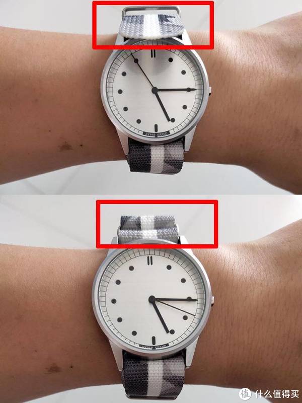 作为一款中性表,表带的长度着实长了点,笔者作为一名壮实的汉子,佩戴时也明显感觉表带的长度绰绰有余,更别说是纤纤女子了;但伟大领袖毛主席曾经说过,“有困难,咱们就克服困难”,利用尾部两个表扣,表带正常从底部穿过第一个表扣,之后反穿第二个表扣,完美解决,机智如笔者我啊~不过,反穿后有点臃肿,不过总体效果还是不错的。