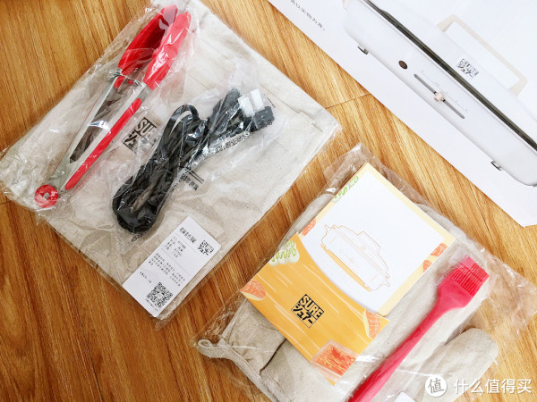 另外,标配版还赠送了厨房四件套,分别是硅胶夹、刷子、围裙和防烫手套一副,都是非常实用的配件。而它的说明书也很用心,是一张张独立的卡片设计出来的产品介绍、使用说明和多种菜谱的大集合。