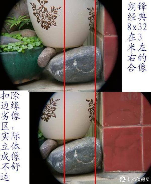 大家要注意,除了平场镜,普通望远镜整个视野当中只有中心一块区域是清晰的,边缘画质是有或大或小减弱的。朗锋经典832的合像在图中看着还勉强过得去,实际肉眼观测相当不舒服。
