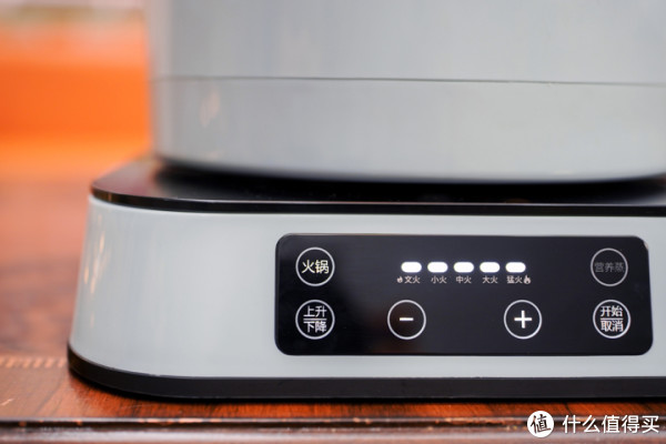臻米升降电火锅有火锅和营养蒸两大功能,有5档火力可从选择,上面还有一个一键升降控制键。控制面板上的功能按键有明显的标识,操作比较简单。