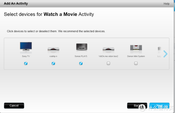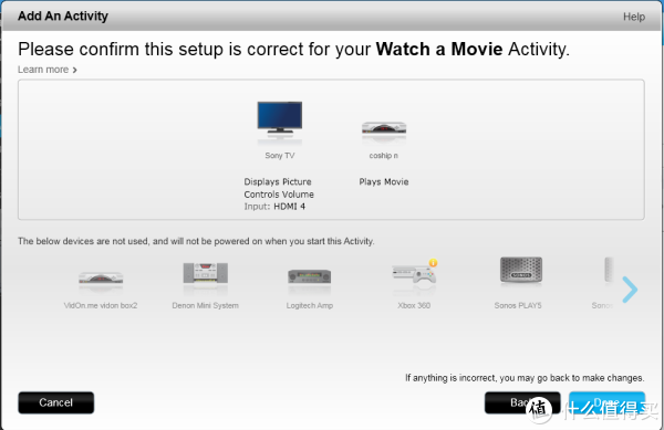 设置各种不同的设备,使它们能够与遥控器协同工作,这同样是一件非常简单的工作。应用首先会扫描你的Wi-Fi网络来寻找兼容设备,然后要求你输入设备的厂商和型号,以便让Harmony选择正确的命令集。只有创建activities(活动)的过程稍稍麻烦一点,activities是发送到具体设备的一组命令。