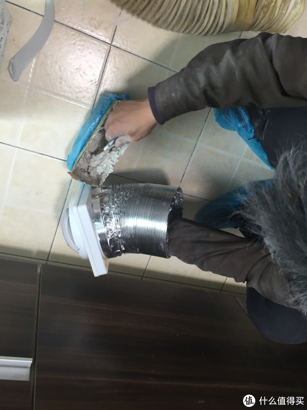 这里楼主装了一个排烟宝,听师傅说这个是防止外烟反流到室内的,价100元!下图师傅在给楼主安装排烟宝,上面打上腻子。