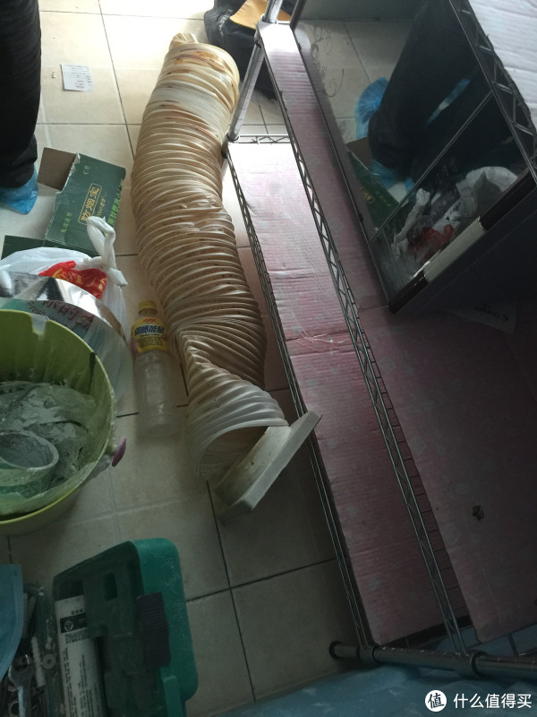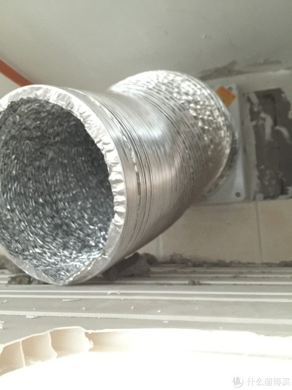 旧油烟机先拆下来,可以看见墙上十分恶心的油污。露出了半截原来排烟管。安装师父说,也可以决定不安装新的排烟管,那样就可以不拆吊顶。但是楼主看了一下新的排烟管,新排烟管是铝材质的(或者是金属材质?哈哈哈,楼主也不知道,反正比原来这个塑料的强),所以楼主决定虽然麻烦但是还是要从里到外都换新!