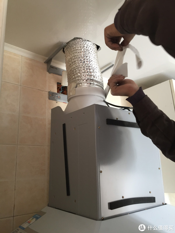安装完成之前还需要接好排烟管!师父在认真的缠胶带!
