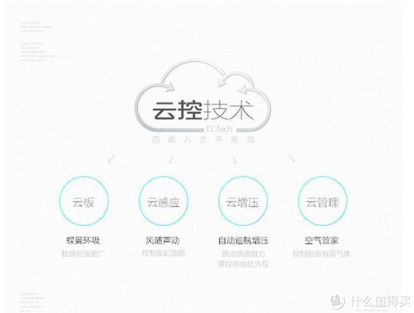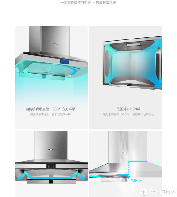 智能油烟机的几种技术,包括蝶翼环吸,云感应、自动增压、空气管家。