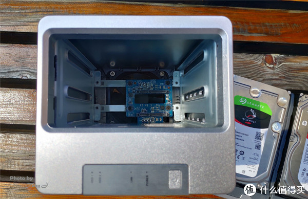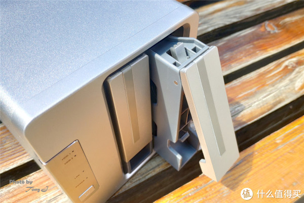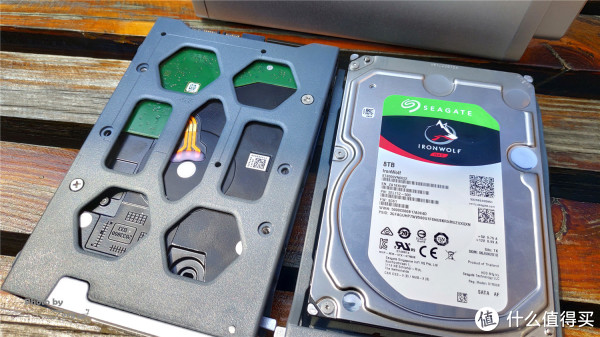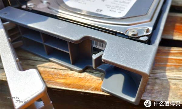 硬盘托架采用的是塑料材质,需要用螺钉对硬盘进行固定,这点稍稍有一些不便,尤其是初初期设置的时候会反复进行硬盘的拆装,比较麻烦,如果能设计为卡扣式无螺钉设计相信会让使用者更加便利。但在硬盘的多各类兼容方面做的还是比较好的,可以装配2.5寸、3.5寸两种型号的硬盘,3.5" SATA HDD、2.5" SATA HDD、2.5" SATA SSD都可以进行安装。