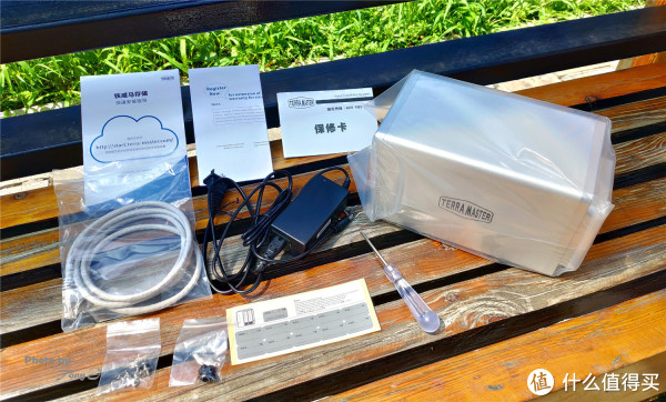 包装内林林总总的产品主要有:主机、电源适配器、千兆网线、硬盘标记贴纸、螺丝钉若干、产品手册若干、保修卡以及一把附赠的十字口螺丝刀。其中属硬盘标记贴纸与附赠的十字口螺丝刀最为贴心,毕竟这两样产品是用户在使用过程中十分需要的。