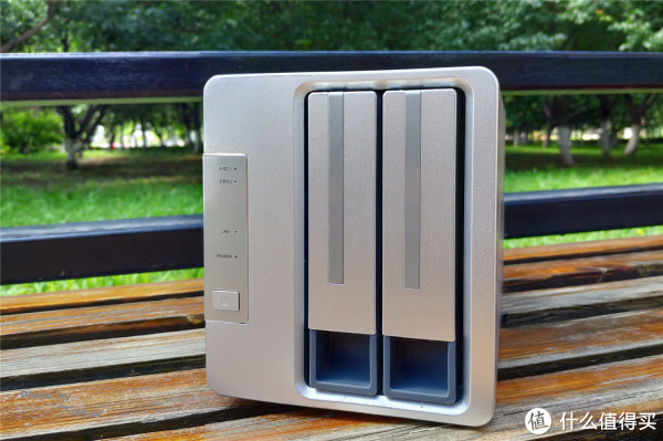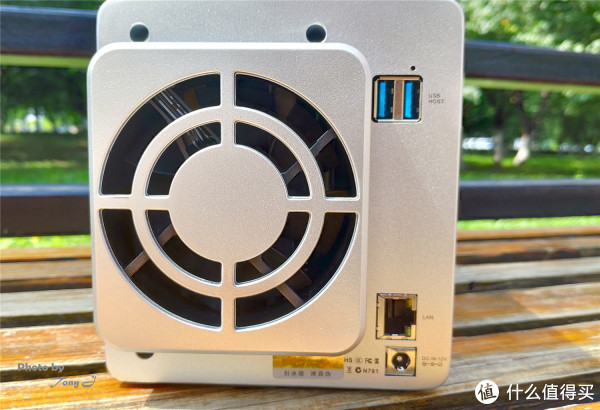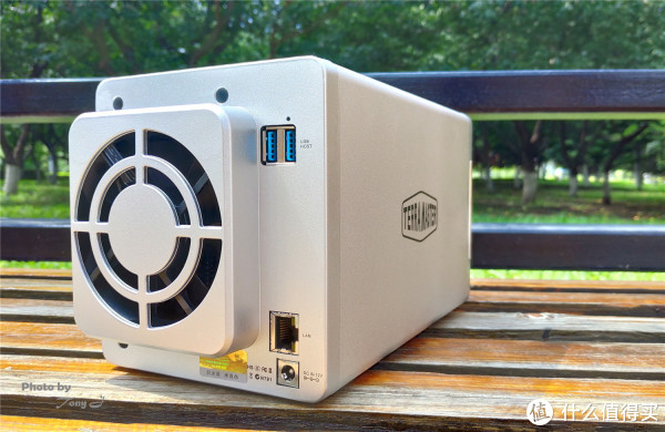 正面的两盘位为立式设计,最左从上到下分别为:HDD1、HDD2指示灯,网口指示灯,电源指示灯与电源键。背部从上到下分别为:2个USB3.0接口,千兆网络接口,电源接口,左侧为80 x 80 x25毫米风扇1个,值得一提的是风扇采用了智能控制,模式为智能、高速、中速、低速四种模式,由系统自动控制。