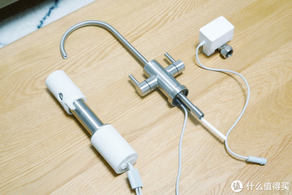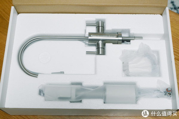 配件上,从左到右分别是UV杀菌、双水龙头以及智能三角阀。