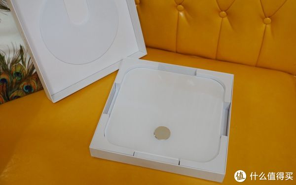 打开之后可以看到包装在防护方面做的还是很到位的,产品四周都被防撞海绵牢牢的固定,而且盒盖上也同样贴有一层圆形的防护棉,保证了云康宝体脂秤表面不会受到任何损坏。