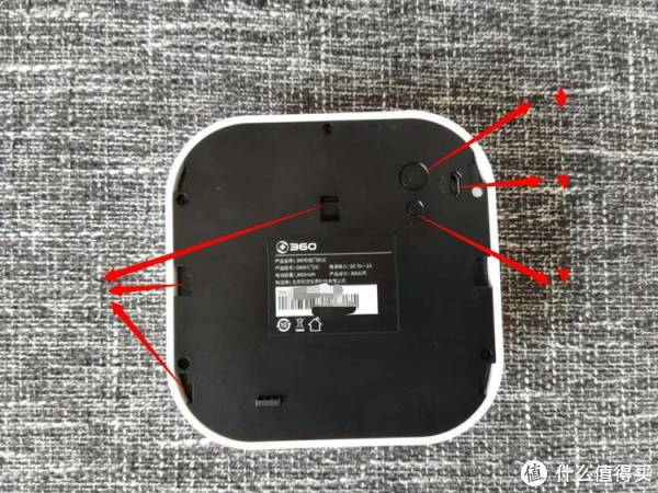 门铃背面右面三个箭头所示分别是电源键、充电口、重置键。左面箭头所示是安装在卡座上哦卡口。主机内置电池2600mah,按照这款门铃节能设计,正常家庭使用一年大概5到6次充电,几个月充一次,不要太省电哦。想想咱们手机每天一到2次充电,真是没法比,我用360手机还得两天一冲呢。门铃主机下端是扬声器和拆机孔,扬声器是为来客准备的,拆机孔内插入顶针一顶轻松可把主机拿下去充电。