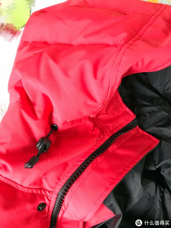 ▼ 衣服的颜色,我很喜欢(下单时,这款衣服4色中,有3款——黑色、深色、红色可以选择,我选了红色),现在唯一担心的就是尺码。结果,真的是越担心什么,就越会发生什么。说好的,加拿大鹅都会大2码的呢?我穿是可以勉强穿上,但是肩部明显小了,最最重要,拉链拉不起来啊!一下子,心情跌倒谷底。