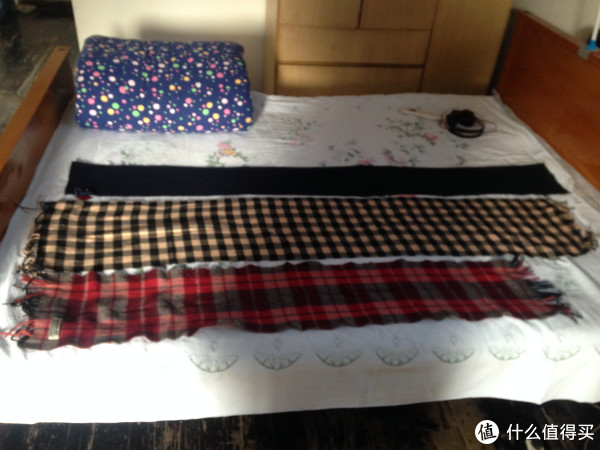 红色的围巾是十年寿龄的羊毛围巾,可以看到,三条中红色最短,Phenix相对的不是很短哦,最窄的是它,但是由于是线编的所以四面都有靠边比较圆滑,也不需要对折!