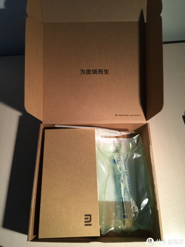 打开之后先发现的不是东西本身,而是盒子上的一句话“为发烧而生”,小米的态度还是很赞的(质量先不讨论哈)