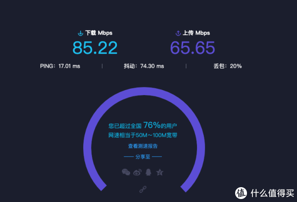 未开启加速:下载带宽85.22Mbps,上传65.65Mbps。
