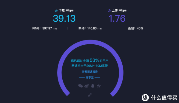 单独4G网络下,下载速度39.13Mbps、上传1.76Mbps相当于20M-50M的带宽速度,速度还是相当快的。