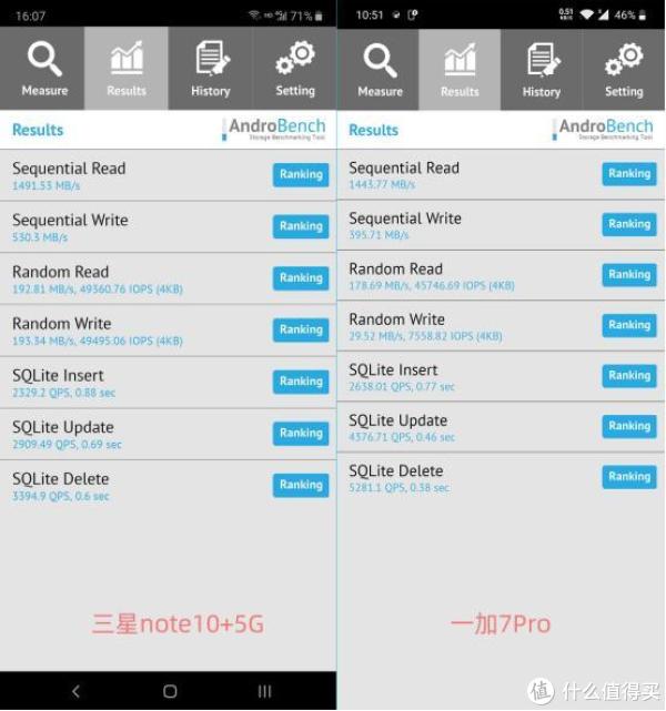Androbench 测试结果显示,采用 F2FS 文件系统的三星Note 10+5G连续读取 1491.53MB/s,连续写入 530.3MB/s,随机读取 198.81MB/s,随机写入 193.34MB/s。一加7 Pro 连续读取 1443.77MB/s,连续写入 395.71MB/s,随机读取 178.69MB/s,随机写入 29.52MB/s。