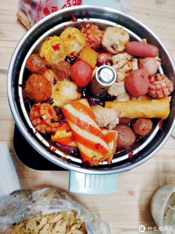 锅的容量为2.5L,对于三四个人来说,虽然锅呢稍微有点小,但是呢也够用。聚在一起最重要的就是分为,在锅里添水,锅的内胆有最高水位线,尽量不要超过。因为其加热的地方位于正中央,锅内水也较多,食材也多,等水烧开的时候滚烫的汁会沸腾到外面。不要问为啥不盖锅盖,因为随时准备吃。锅盖是镂空设计,盖着锅盖也可以升起来,然后再取下来锅盖。
