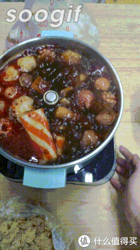 提篮拿掉,倒入火锅底料,然后把提篮放进去,这样做的目的就是把花椒这些等与锅里的食材分开,更加用心的设计,然后放入食材,坐等开吃。但是因为这锅有升降功能,所以呢?我们应该用一键升降功能,把提篮升起来,放入食材,最后降下去,坐等开吃。这样的好处就是我们吃火锅放丸子的时候,汤汁不易飞溅。