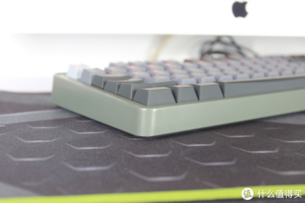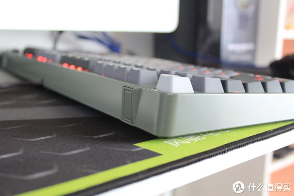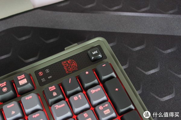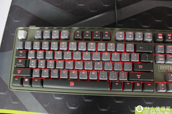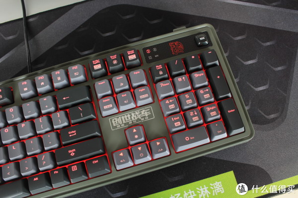 TT创世战车采用标准的104键键盘布局,外壳采用军营绿色,键区整体上以灰、黑、浅灰等几色分割成了几个不同的区域。