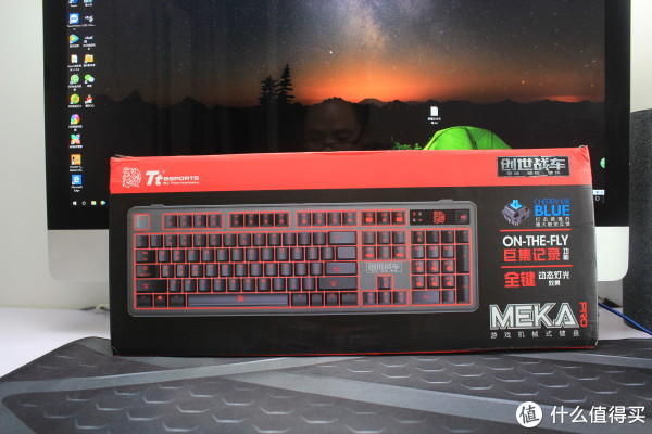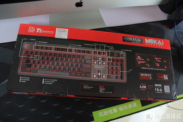 到货后发现,TT创世战车这款键盘外包装仍同样以黑、红两色为主配色,突显其为电竞类型产品。在包装正面,可以获得其采用青轴、支持巨集记录、全键动态灯光等主要卖点,属MEKA PRO系列。