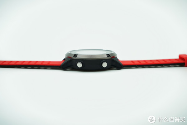 硬朗的表盘加上红色的腕带,让这款手表炫酷的同时还有些运动气质。1.04寸的黑白TFT常显圆屏,在清晰显示的同时,功耗也很低。330mAh的锂离子聚合物电池,可支持35天的超长待机,以及4场全程马拉松的记录。我拿到手表已经一周多了,余电仍然未用完。圆屏边缘的刻度妆点着表盘,再往外是深灰色合金,四颗硕大的螺丝看起来并不友好,但仔细一看却又意味深长,深灰色的螺丝配上同色的合金,让整块手表更加硬朗更加有活力。