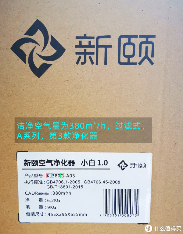 外包装侧面标明了产品的基本参数,根据国家标准GB/T 18801-2015《空气净化器》就可以大体知道这款净化器的基本参数。虽然这个标准并不是一个强制性的标准,但绝大部分正规的企业,还是会根据这个标准去执行的。这个参数也是我们选择净化器的重要参考。具体产品命名方式如下: