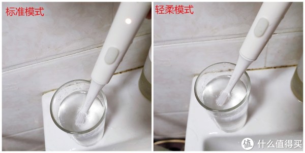 ▲米家声波电动牙刷T100共有标准模式和轻柔模式两种模式,短按开关键即可开机,牙刷自动进入标准模式,再次短按开机键切换到轻柔模式。从照片可以看到在标准模式使用时,水波圈范围较大,震动幅度较大;在轻柔模式使用时,水波圈范围较小,震动幅度较小。但是在标准模式下,牙刷使用时的噪声略有点大。在使用牙刷过程中,每种模式使用2分钟后,机身就会震动一下提醒换区。