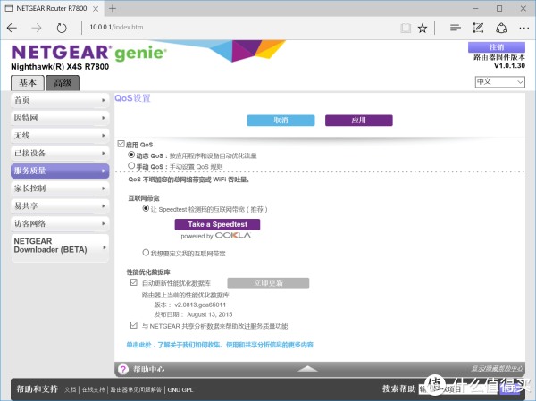 服务质量选项里,就是大名鼎鼎的硬件级QoS设置了,立即启用,再把优化数据库更新到最新。