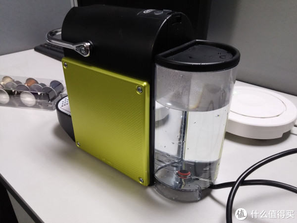 先是咖啡机外观,选了这个柠檬黄的,德亚上的型号都是NE125,后面带的S/L/R/M什么的都是颜色的区别,后面的是水箱,听说国外的都是直饮水,国内的话用自来水一个容易有水垢,一个是烧不开(实测确实做出来的咖啡不是100℃的开水),所以建议用纯净水。新机器先不放胶囊直接做几杯白水,让水流过整个系统清洁一下。