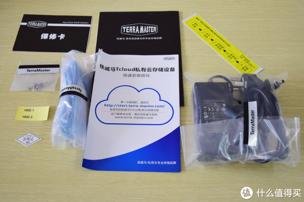 附件盒里的内容物:保修卡、硬盘螺丝、硬盘区分贴纸、合格证、说明书、安装指南、千兆网线、电源适配器