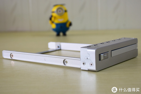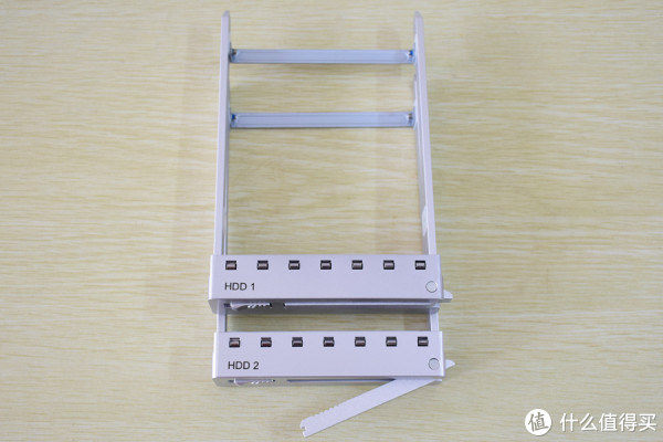 硬盘架:角上有贴上HDD1 HDD2,搭配配件中给予的同款贴纸,用来方便的区分硬盘原始位置。不过遗憾的是看孔位,貌似原生不支持2.5寸硬盘,只能使用3.5寸盘,2.5的需要自行用转接盒转换为3.5尺寸再接上。