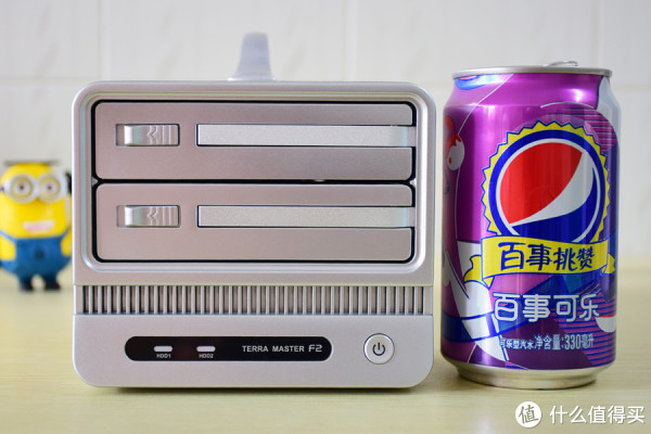 NAS正面:双盘位抽拉架设计,支持热拔插,硬盘位下方是一排散热孔,也貌似是除了菊部,唯一的一个散热孔,最下方是HDD的两个状态灯以及电源键。
