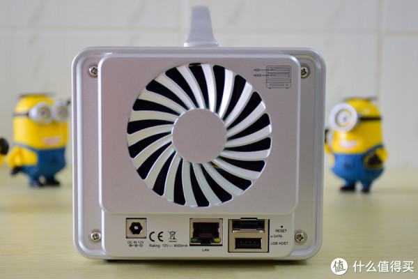 菊部图,大菊花里面是散热风扇、下面从左依次是:电源接口、千兆网口、ESATA+USB2.0,ESATA接口近几年好像不怎么流行了吧?但却流行的USB3.0接口没有看到,且只有一个USB接口。