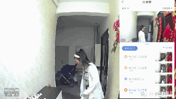 使用“360智能摄像机”APP,可以免费查看2天内的门前所有监控视频云存储循环记录,如有需要还可以在商城另外购买7天、30天循环存储空间。给大家展示下朋友家使用360可视门铃1C在160°广角下拍下的视频镜头: