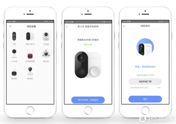 安装固定后,在手机各大应用商店下载“360智能摄像机”APP,360可视门铃1C开机后,根据语音提示即可逐步完成门铃的添加与绑定。绑定成功后,即可通过APP查收门前实时动态信息及设置门铃相关参数配置。