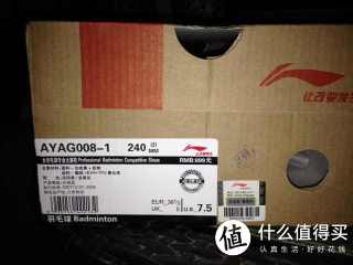 鞋盒上的标签!吐槽一下李宁最新的鞋码编号,什么38 1/3和39 2/3,让人眼花缭乱……各位选鞋的时候还是要根据你的脚长来选择,如38 1/3就是240mm,我的脚是235mm,所以就可以选这个号。此外,据说李宁的多数羽毛球鞋的鞋楦比yy的窄,脚宽的smzdmer们最好还是去店里试一下!
