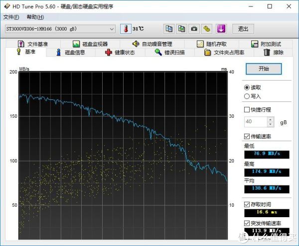 3T希捷监控盘,笔者是用HD Tune Pro来测试的,最终平均138.6MB/S,这样的成绩跟笔者之前放在机箱内直接连接主板的测试成绩是一样的,不过突发传输速率就差了一些。