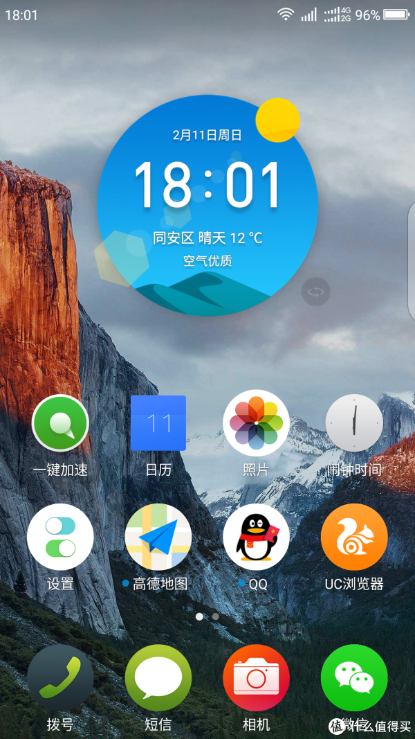 ①刚到手,开机后的开机显示页面。手机墙纸随大流,直接把Apple的电脑壁纸拿过用了。其他APP的图标也尽力简洁化。