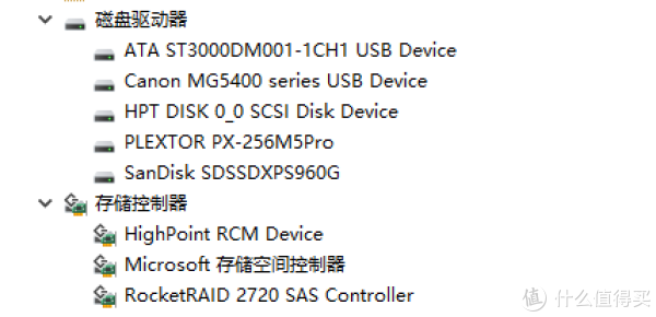 Windows下面的显示。可以看到磁盘驱动器里面认出了两块硬盘都是在ASM1156主控下面。同时存储控制器里面也有一个USB大容量控制器设备。