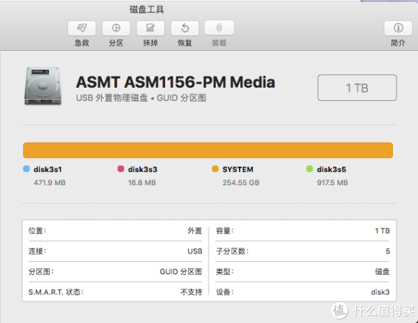 首先先连接电脑看看芯片信息吧,因为比这款便宜40块的那款看评论就有很多人说商品介绍是ASM1156,但是实际收到货是JSM的。那么我也先来看看吧。Mac显示,芯片ASM1156无误。