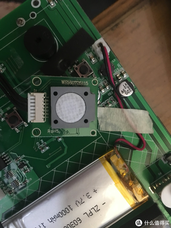 拆开的一瞬间发现绿油油的PCB板~~还是觉得黑色板高端大气上档次点啊~~里面电子元件排布还算可以~~有一个甲醛检测仪就在背壳用一颗螺丝锁紧了,拆看一看型号显示是ws160725115,而且样子怎么那么熟悉的~~原来悟空M1也是这样的