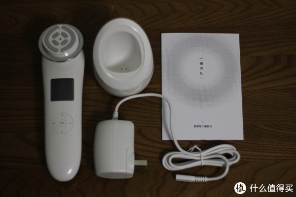 打开盖子里面是嫩肤仪,配件比较简单只有底座和适配器,另外就是说明书和合格证了。